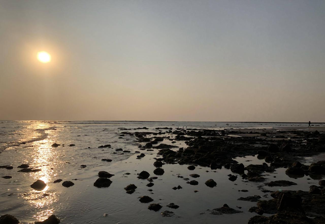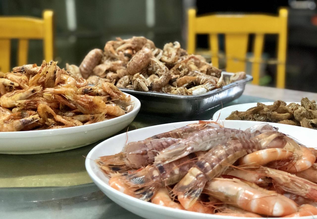 我们跟着大姐来到她家的渔船前,周围到处都是小餐馆,有的人已经在美滋滋地品尝自己的“战利品”了。走在沙滩上,映入眼帘的是各种宝贝,有贝壳、小螃蟹还有钉螺。这些小的海产品在我们眼里是很难一见的,但是在海边却是稀松平常甚至是大家都不要的东西。