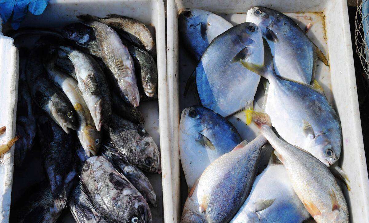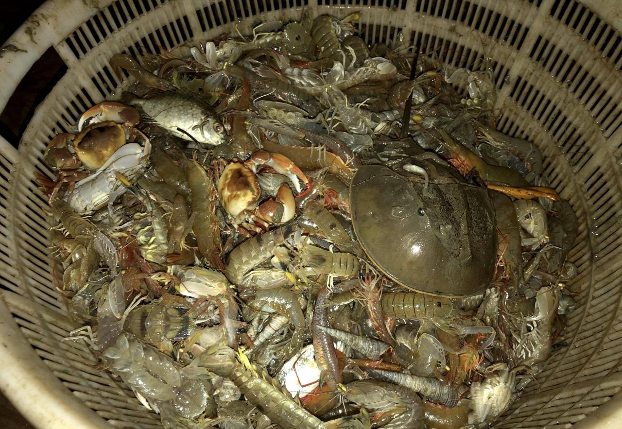先收起一点网以后,把两块木板拽上来,然后漫长的收网过程就开始了。收网的时候船的晃动比较大,这个时候一定要注意安全。收网收了20分钟,才看到了我们的此行的收获,慢慢一网的鱼虾哗啦一下就倒在了准备好的框子里。虾在不断地扭动着身躯,螃蟹还试图想要逃跑,鱼也在不停地动来动去,每一种海鲜都十分鲜活。