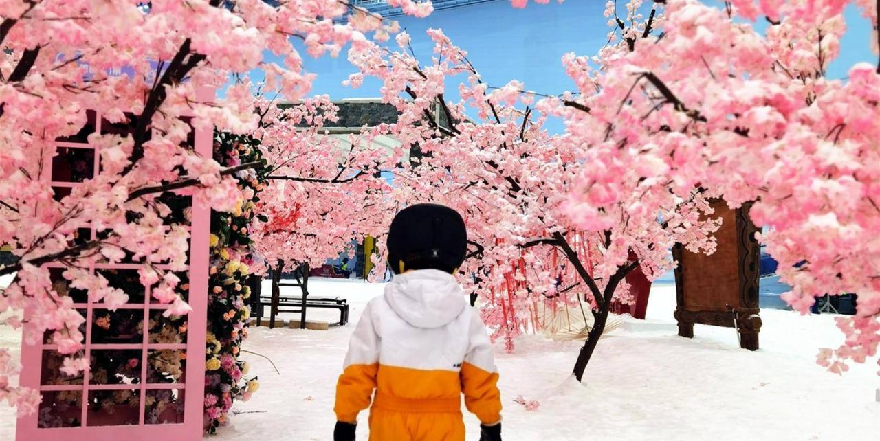 娱雪区在整个室内雪场的正中央“盆地”区,最近有一大片“桃花林”,很适合拍照