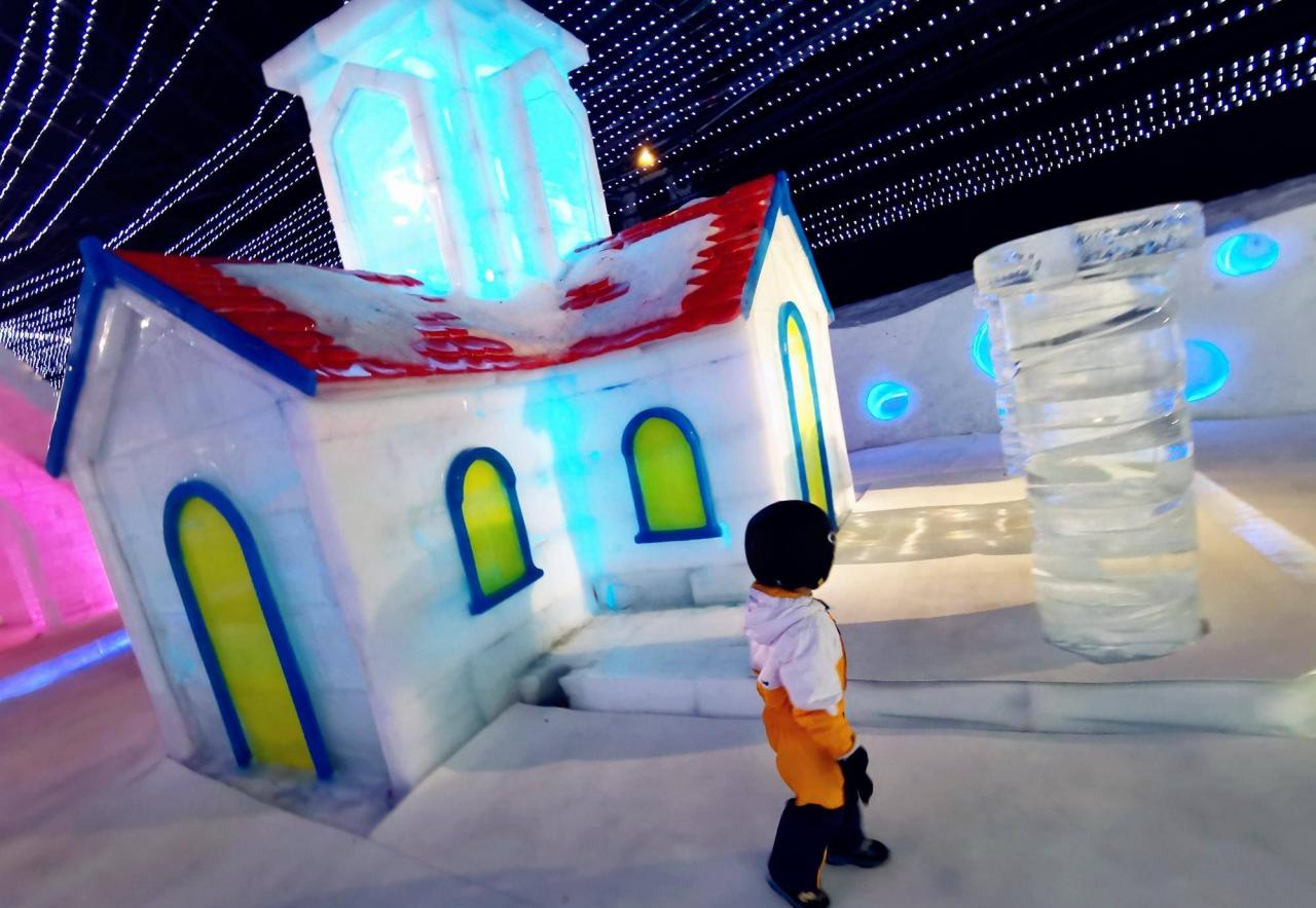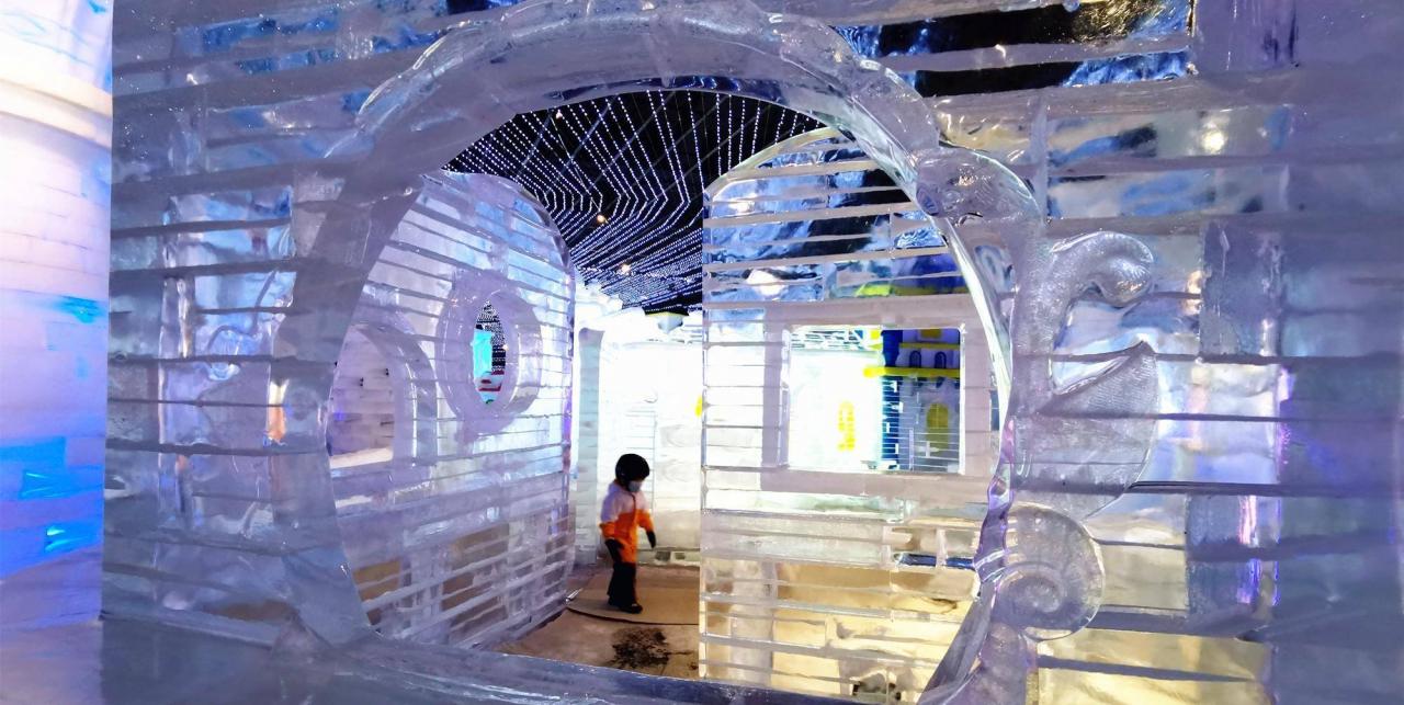 两条初级道的“山洞”里,还有一个小型的冰雕展,南方的孩子很是稀奇。