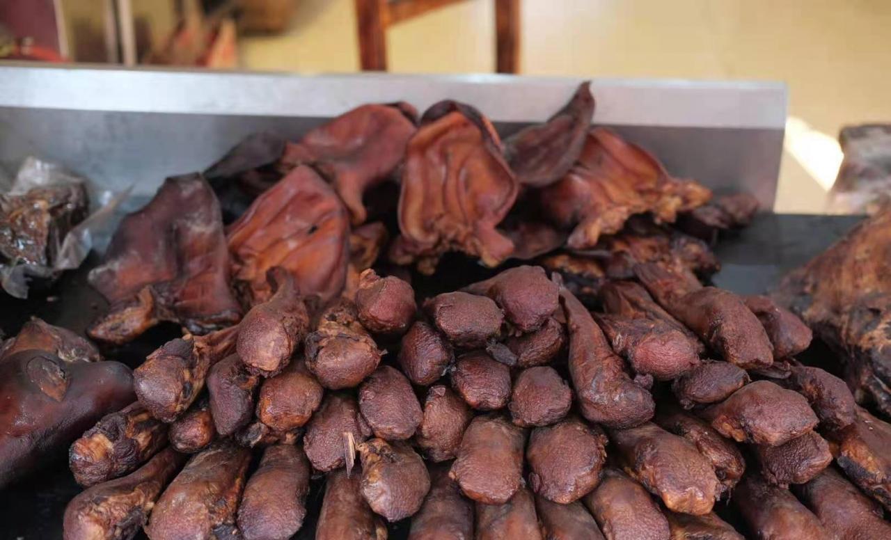在小镇上,还有一些人家在晾腊肉香肠。成都人无辣不欢,在年货上也是码足了料,香肠必须是麻辣,有些甚至在腊肉上也会涂一些辣椒,放在外面痛风吹上几天,等吹干了,味道超香,可以吃好几个月呢。穷鬼小时候在成都的农村待过一段时间,那个时候过年外公外婆总会杀年猪,肉够吃一年。现在成都过年杀猪的人少了,更多的人选择去集市买肉来吃。