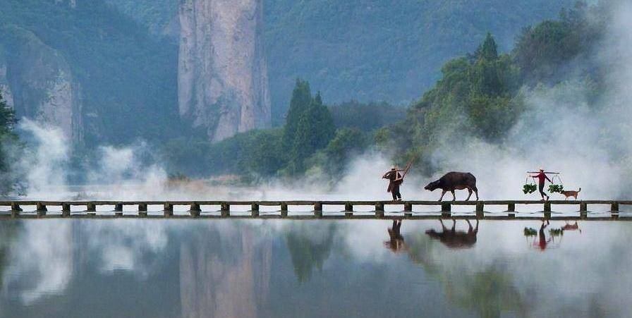 第二个要说的便是朱潭山。朱潭山被大家所了解得益于一位著名摄影师——吴品禾。上世纪末,吴品禾在此地拍摄的一张照片获得了国内外许多奖项,更是为朱潭山吸引的不少游客。湖岸边绿树如茵,杨柳依依,湖面雾气缭绕,恍如仙境。河堤上,老人牵着黄牛,农户挑着担子,还有一条黄狗默默跟着主人……令人心旷神怡又引起无限遐想,真不愧为“人间仙界”。