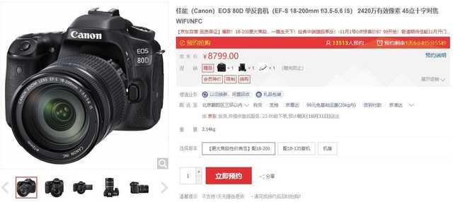 一、推荐机型:佳能80D套机(EF-S 18-200mm f/3.5-5.6 IS) 参考价格:京东商城8799元(送大量赠品)