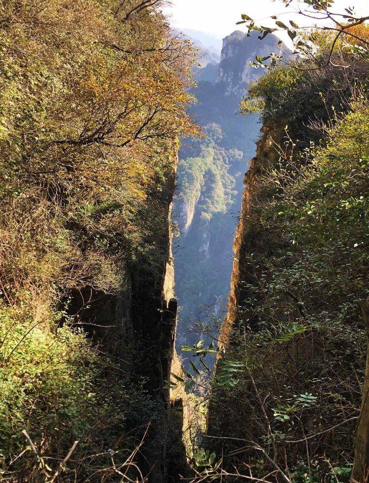 头顶山峰刀劈斧砍,倚天拔地,脚下绝壁深涧,幽谷万丈深不见底,森森冷气拂面而过,每一步都惊心动魄。