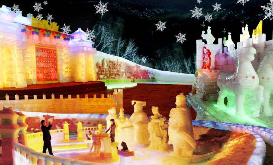 看完门口盛大的开园表演再到马场去,看一看马术表演,表演者骑在奔驰的骏马上做出各种高难度动作,游客在场外看得热血沸腾,既感到惊艳,又觉得新奇,为表演者捏了一把汗。伴随着紧张刺激的心情,看完只剩满口的赞叹之声。在网络上爆火的是“冰宫”这个景点。小编觉得这个景点其实更适合孩子们玩。大人冬季回家带娃不知道去哪里玩的话,选择冰宫准没错。