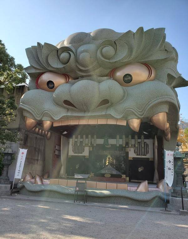 藏身在最热闹的难波巷内中,位置在大马路后面一条小巷弄,对于一般的旅游者来说,很难发现它的存在,这个神社拥有超吸睛巨无霸狮子头,这狮子头有12米高。狮子头的嘴巴里面是舞台。有950年的历史。能祈求学业和工作顺利。