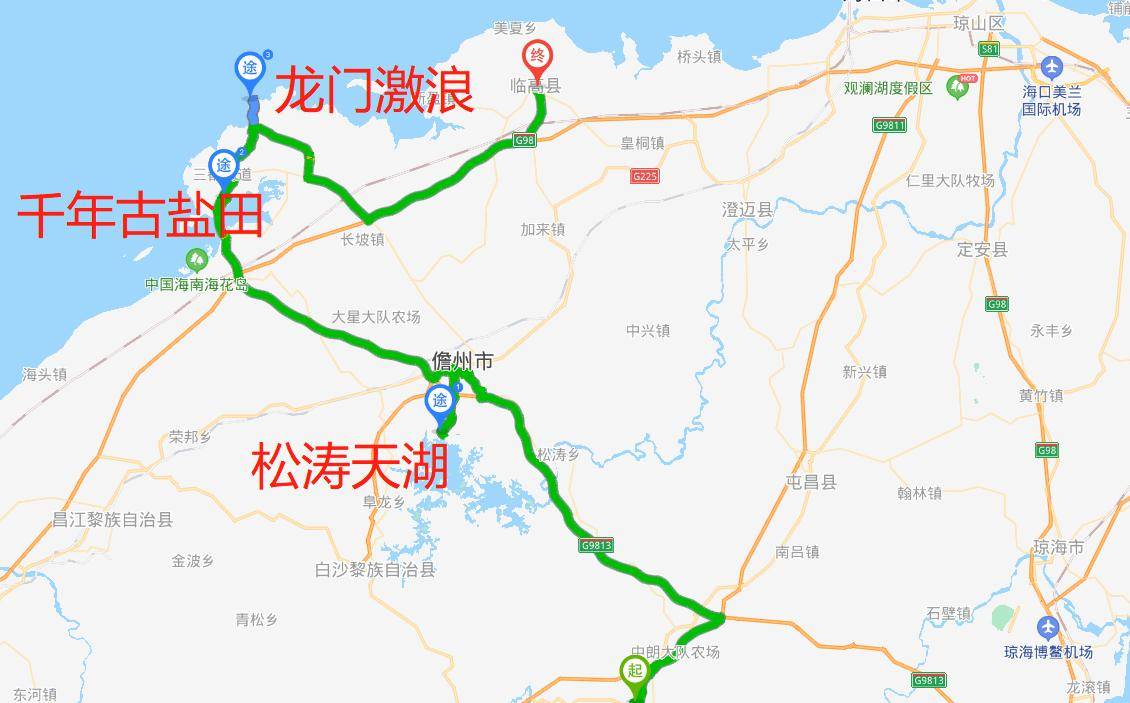 今天250公里,4个半小时的开车时间,沿途主要游玩一个松涛天湖,然后过儋州往洋浦方向游玩千年古盐田,下午往临高县自驾,时间来得及可以再去一下龙门激浪。