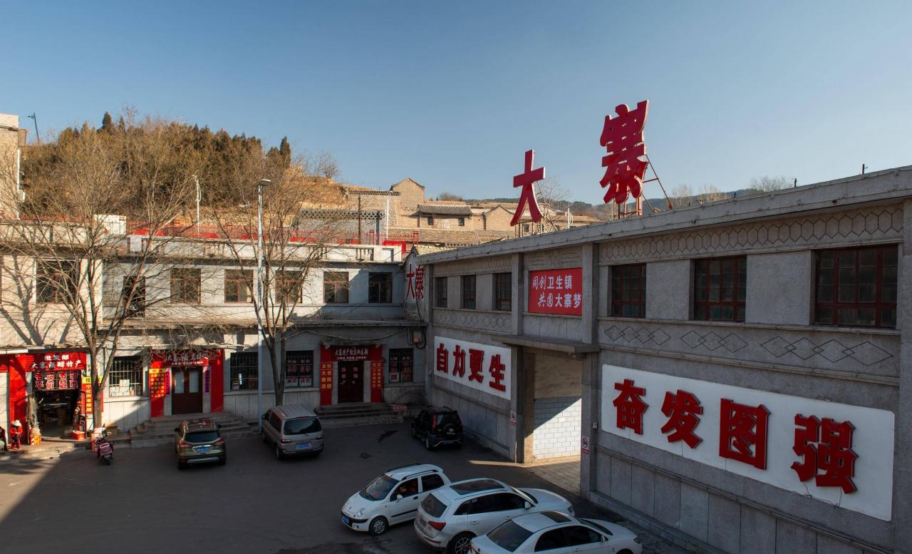 而今,大寨早已撩去它那层神秘的光环,回归了既往的山村本色。看完大寨人民公社旧址,再看看现在的村部。鲜红的“大寨”二字矗立在大门之上,“自力更生、奋发图强”两幅标语鲜艳夺目,标识着新大寨精神,令人振奋。