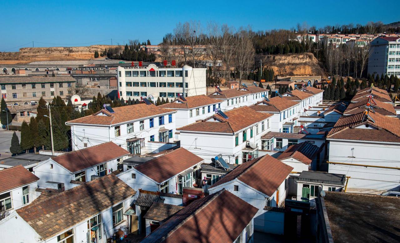 站从虎头山俯瞰,如今的大寨早已旧貌换新颜。蓝天之下新村中一座座楼房、别墅整齐漂亮,在冬日阳光照耀下生机勃勃。经过几十年的奋斗,大寨人真正地摆脱了贫困,过上了自己的幸福生活。