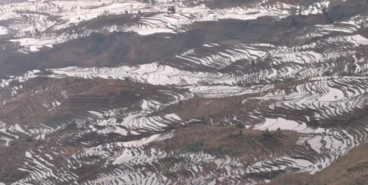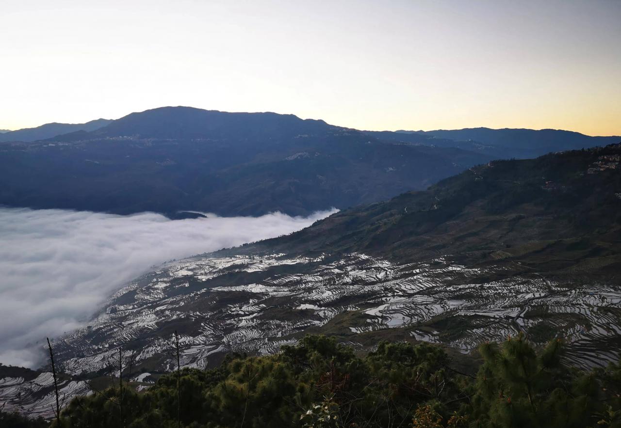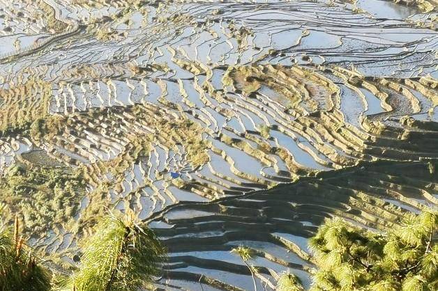 弥漫的梯田在晨曦中似水银泻地,银光闪闪。