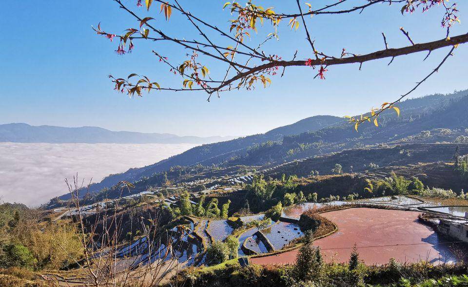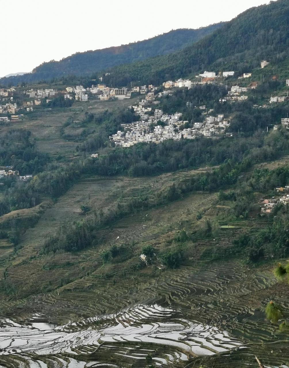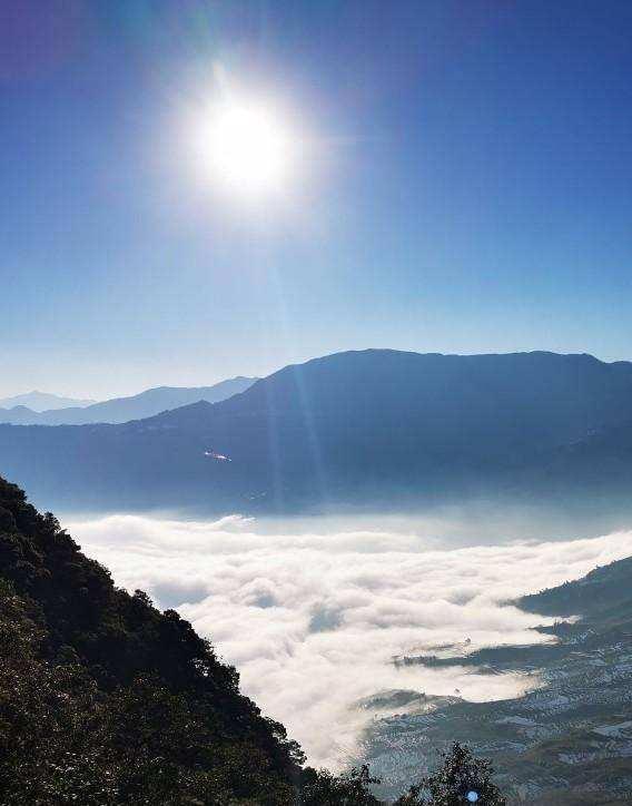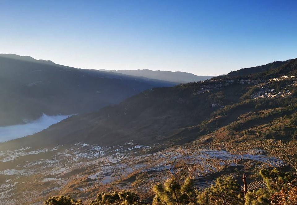 不知是气压,还是温度,或水汽的原因,海拔更高的山头、山坡形成不了云雾,漫坡的梯田清晰可见。