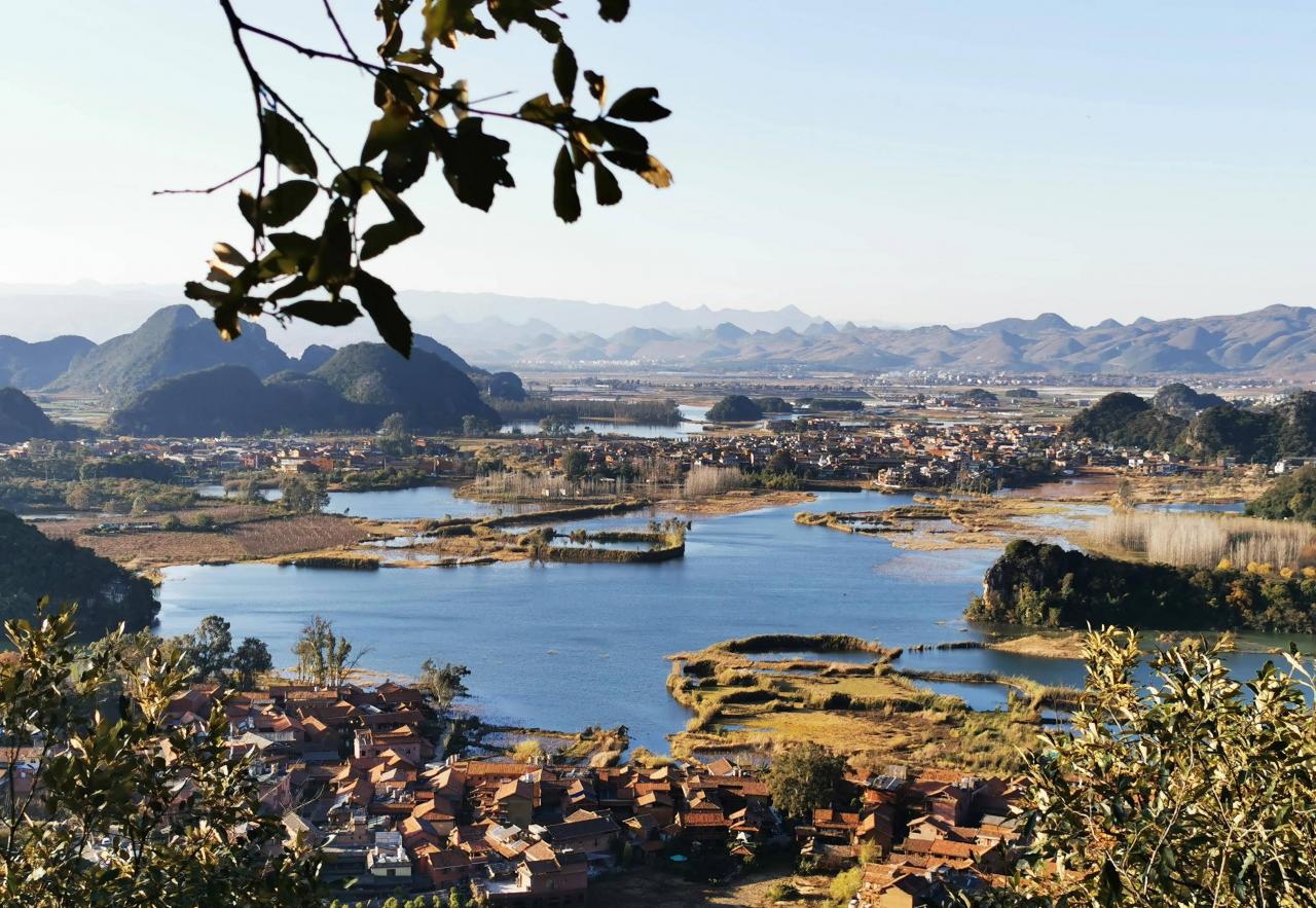 站在山顶上,可以瞭望南西北三个方向的景色。近处是仙人洞村,远处是普者黑村。