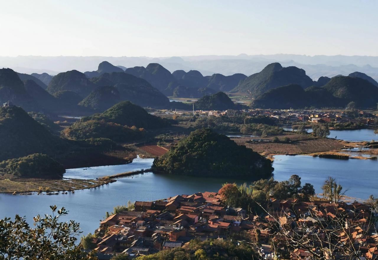 下了山,我们驱车赶往四百公里外的普者黑。“普者黑”,望文生义,这个名称怪怪的,“普者黑”不是汉语,是彝语,意为“鱼虾丰满的地方”,那就说普者黑有水,确实。普者黑地处云南文山州丘北县,虽属云南省,但却是喀斯特岩溶地貌,不仅有水、有山,还有溶洞,资料介绍普者黑有80多个湖泊、200多座山峰以及明可数、暗不清的溶洞,有“水上田园、湖泊峰林、彝家水乡、岩溶湿地、荷花世界、候鸟天堂”之美誉,是国家AAAAA景区。普者黑的交通比较发达,不仅有公路,(下高速公路后,行驶50公里国道),还有高铁和邻近的砚山机场。普者黑景区有两个自然村落,一个是普者黑村,另一个是仙人洞村,但行政村名为普者黑村,从外表看,仙人洞村更具人文气息、现代些,民宿、饭店、酒吧鳞次栉比,普者黑村则规模大一些,比较古朴,两个自然村都为彝族汉族混居村,为争夺游客入宿,都说自己是普者黑的正宗,景点多、色更美,不过这两个村都有住宿,游客可选择其中之一入住,游玩整个景区,则不分你我。我们住在仙人洞村,老板来自湖南,从彝族人手上接管了民宿,花了上百万重新装修,不料疫情无情,住客骤减,原来900元的房间,只收我们90元,惨淡经营,维持生计。我们傍晚到达,老板建议我们先去仙人洞,我们对溶洞兴趣不大,老板说,那座喀斯特小山不仅有洞,站在山顶还能俯瞰整个普者黑,我们顿时兴致盎然,花了半小时不到,就登上了顶峰。真是会当凌云顶,一览众山小,山峰、湖泊、田野、村庄尽收眼底,那一座座驼峰似山似岛,更似乳房,挺拔秀丽,那水蓝得像大海,却一点不张扬,平静如镜,能容纳世上所有的荣与辱,“山有水而秀,水有山而媚”,唯有那村庄不是上帝的杰作,却不可或缺,更加映衬喀斯特地貌灵性般的俊美。夕阳在徐徐落幕,余晖洒落在普者黑的山山水水,分外妖娆。我们陶醉了。