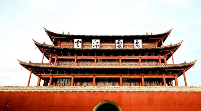 朝阳楼又称迎晖门,是建水古城的标志性建筑,有“小天安门”之称,由48根巨大木柱和无数粗大的楹榫接成坚固的木构架,面阔五间,进采三间,巍峨雄伟。建水文庙始建于元代,后经明清两代扩建。文庙总体布局采用中轴对称宫殿式,仿曲阜孔庙风格建造,坐北朝南,主要建筑有一殿、二庑、二堂、二阁、四门、五祠、八坊,规模宏大,规制谨严,保存较为完好。