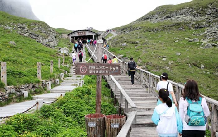 西坡:风景有天池、锦江大峡谷、高山花园等。池西服务区乘车、进山门、候车,排队三次。进山一路上行,山顶需自己爬1442级台阶看天池。当然,实在爬不动有滑竿服务,好像是300元一次。下山去锦江大峡谷,风景不错,至于高山花园,花期不好掌握,路过瞅瞅得了。