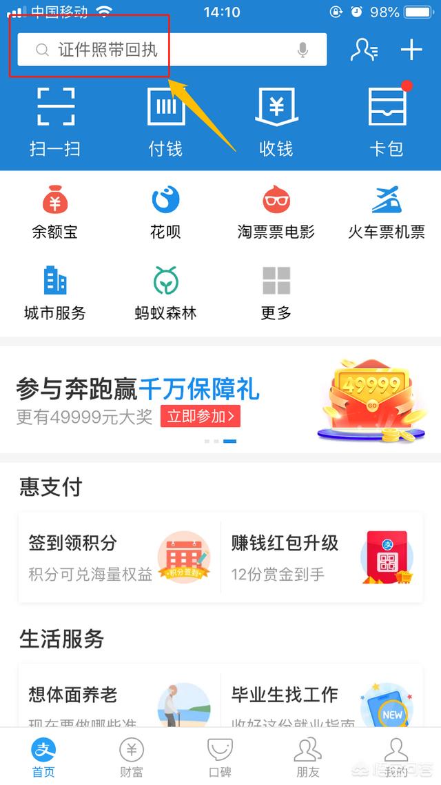 1、打开支付宝,在首页搜索“证件照带回执”。