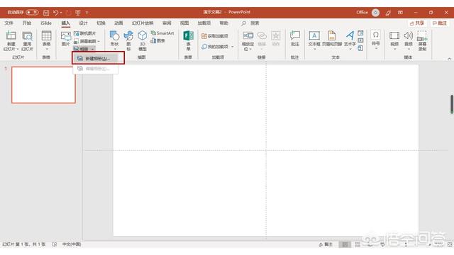 第一步:打开PPT,新建空白幻灯片,菜单选择“插入”-“相册”-“新建相册”