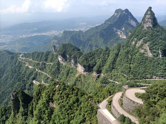 山下的盘山公路,当年为了推广张家界旅游,做了很多活动,比如自行车速降、哈雷摩托骑行上山等等