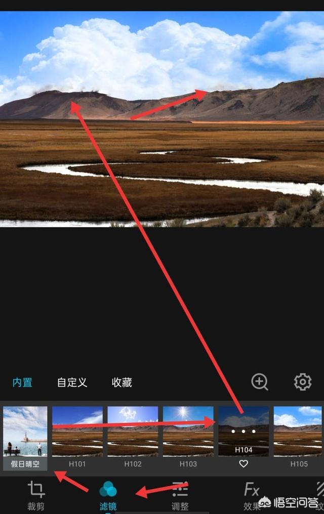 (4)在文件夹中找到夏日晴空和漫空祥云,这两个滤镜,添加到软件上,然后点击假日晴空中的H104。我们发现,照片的乌云,灰色天空,就被换成了蓝天和白云,但是,山的边缘还没有处理好,还有一些乌云的瑕疵,所以,再把这张照片保存。