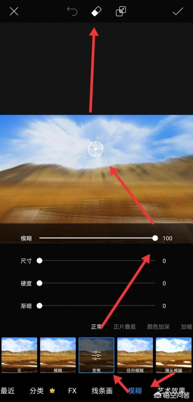 (9)当然也可以通过手机修图软件来修出流云的效果,还是在PicsArt中,点击特效选择特效中的模糊,在模糊上选择变焦,页面出现一个瞄准镜,他是焦点所在位置,把它移动到云彩中间,参数调整如图所示,再点击页面上方的橡皮,对天空白云下面的山和草地进行涂抹,云彩就会变成流云,草地和山也恢复原原先的状态了。如果只调解一次,流云效果更不好,可以多次操作。效果图,如下: