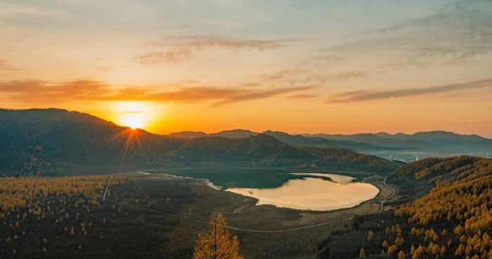 清晨伴随着天边冉冉升起的红日,绚丽的朝霞缤纷夺目,远处山间的薄雾像是一缕缕的白色绸带,缠绕在群山峻岭之间。而巍巍兴安岭尽在你的脚下,此情此景何等的壮丽恢弘。