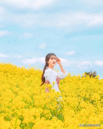 花海很漂亮,但人直直地面对镜头,看起来就会非常呆板。你在花海当中摆姿势的时候,一定要避免。改正方法是,可以参考下面这样的姿势,扭动身体,做一个回眸,另外一只手抬起来,放在眉毛附近,这样就更加自然,不至于太呆板。摆姿势的时候,不想有太大动作怎么办?