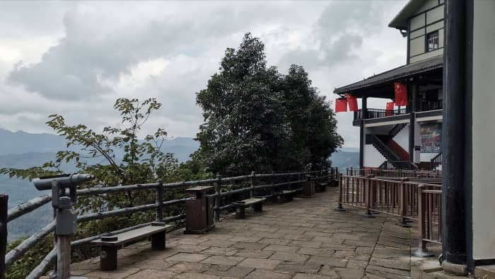 山顶有一个大平台,建有玻璃观景台,有梁山寺,还有舍身崖。看了以后其实是可以沿鸟道走下去到梁山亭,经一线天看石笋峰,在石笋亭景点乘景区游览车到剑门关景区核心景点关楼。结果走了一条费时费力的路。