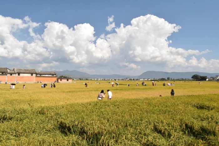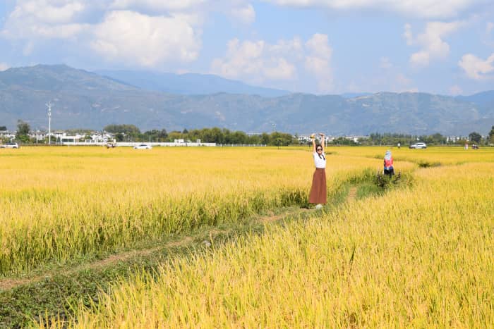 第二个是百亩稻田,我们来的时候正好赶上秋收,稻田里面的稻子还没有收割,一定在这多停留一段时间,这个地方真的是随手一拍即是大片,背后就是苍山,身边是金黄的水稻,非常出片,稻田旁边是一些拍照的网红道具,大家可以自行选择,全部都是免费的。