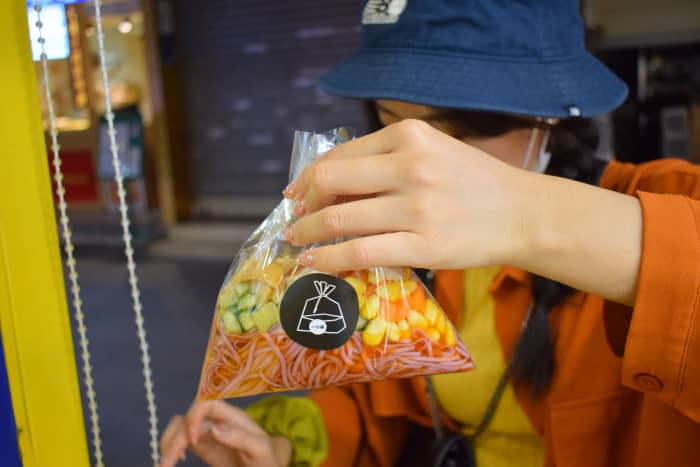 各种颜色的面条装到袋子里,再加上可选的各种配料小包,配上老板调制的汤汁,味道清爽,喜欢面食的我非常喜欢,口感很清爽。