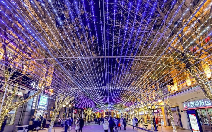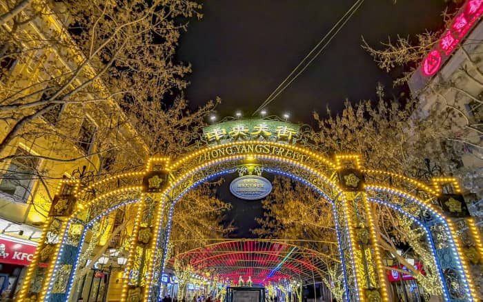 4、哈尔滨中央大街也是著名步行街,各种特色小吃,时尚名牌都集中在中央大街、历史古建筑汇聚一起,是一座北方时尚购物城,中央大街夜景很美,美女如云汇聚的地方,适合各种网红打卡。