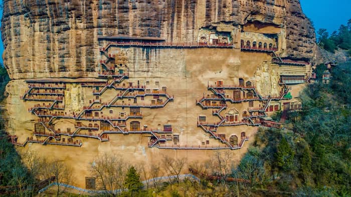 在这座城市中,大名鼎鼎的,当然就是麦积山石窟了。麦积山石窟名列中国四大石窟寺之一,敦煌莫高窟、克孜尔千佛洞等石窟以壁画闻名,龙门、云冈、大足等以石刻造像闻名,而唯独麦积山石窟以泥塑冠绝于世,甚至有“东方雕塑陈列馆”之称。