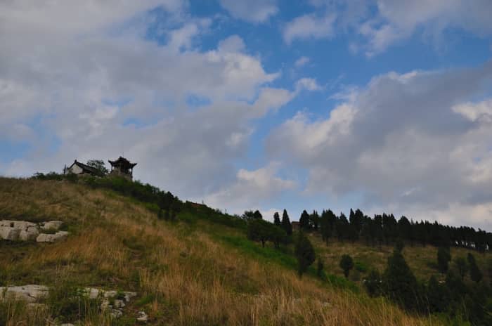 山顶丛林中有一个大哥在采摘连翘籽。详谈后,得知他就是这儿的守山人,专职管护山顶的几座庙。他还称自己有一些特异的通神能力,能帮村里人治一些邪病,不知真假。沿着山顶漫步,仿佛穿行在空中草原,很快就看到三座中型庙宇。庙门上着锁,其中一个是玉皇殿,其它两座没有名,不知端详。