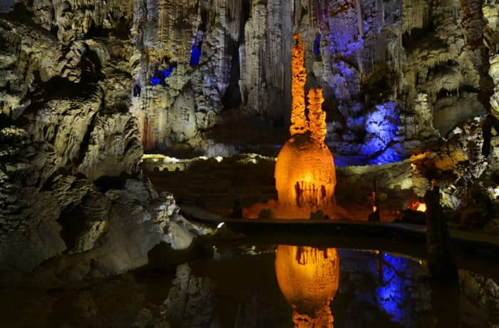 织金洞位于贵州毕节市织金县官寨乡,是一个多层次、多类型的溶洞,也是中国目前发现的一座规模宏伟、造型奇特的洞穴资源宝库,洞中遍布各种形状的石笋、石柱、石芽、钟旗等,形成千姿百态的岩溶景观。织金洞由于整个洞穴景区的游览路线是单向行走路线,所以只要进洞就必须走完全程,从出口出来以后再搭乘电瓶车回到景区门口。特别是那高17米的“银雨树”,挺拔秀丽,亭亭玉立于白玉盘中,人人赞叹。织金洞不仅有很高的旅游、美学价值,而且对于研究中国的古地理、古气象学等都有极高的科学价值。