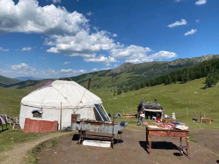 我们这一天住的是毡房,毡房在仙女湖,条件不太好,毡房在草地上,到处是水塘、马粪。不能洗澡,卫生间要出去外面上,然后洗漱都是毡房主人给我们拿的水。里面还生着火,我们当时去的时候是月圆的时候,不然是可以看到银河的。