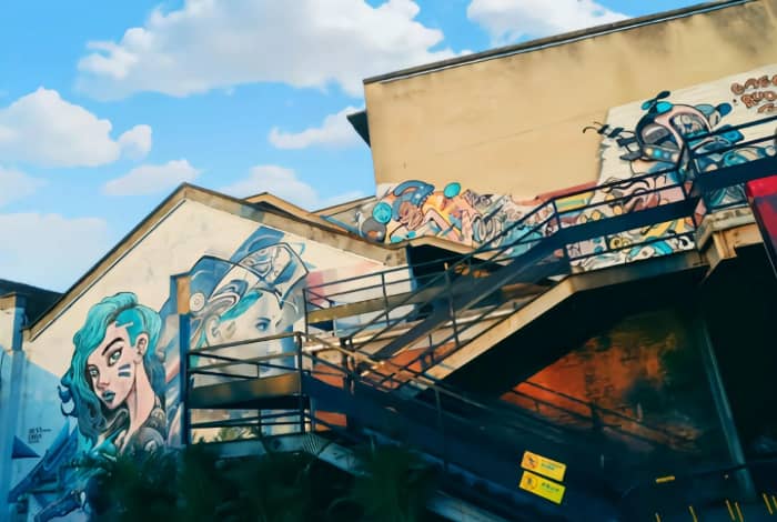 接下来是百益上河城,南宁市有很多由老工厂改造而成的项目,百益上河城就是其中规模最大的一处。这里原身是南宁的绢纺厂,在上世纪九十年代倒闭之后,一直荒废着,也就是在最近几年,改造项目开始之后才变成集餐饮、零售、美食为一体的“新生命”。这里融入现代工业特征,经过创新改造,给予旧建筑新活力。小朋友们很喜欢充满色彩的事物,这让他们很好认知世界。门口的大水塔上面充满着涂鸦,人们很喜欢来这里拍照打卡,从这里进去能看到很多美食车,上面有着五颜六色的样子。说是美食车,其实是半流动类型的车子,上面小吃种类繁多。