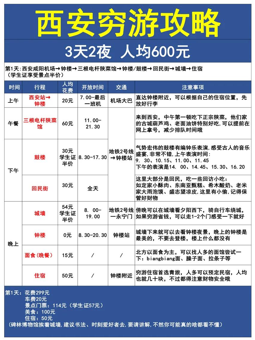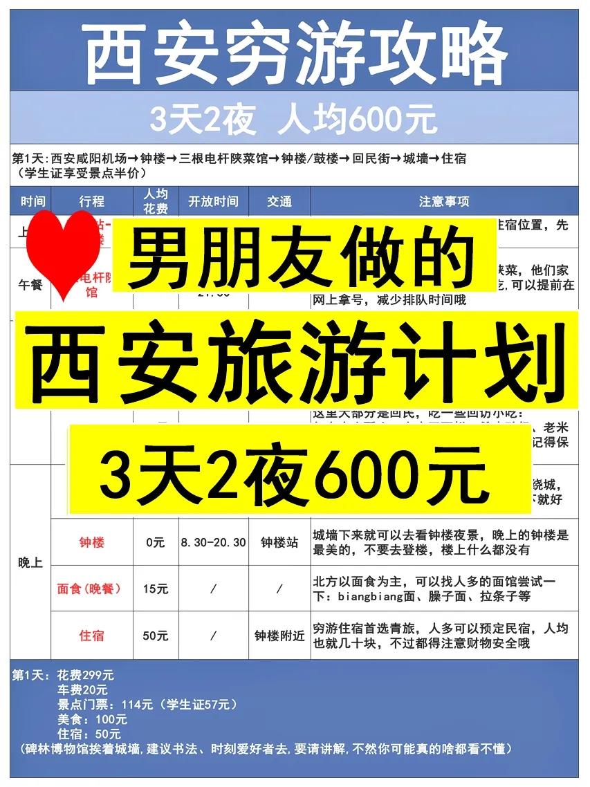 大家都知道,西安可不是一个穷游的城市,如何花600元在西安游玩3天2夜呢?今天别人家男朋友整理了,酸了酸了,快收藏哦,迟早都用的上哒,行程在图片啦,下面整理一下关于最近西安的一些注意事项哦