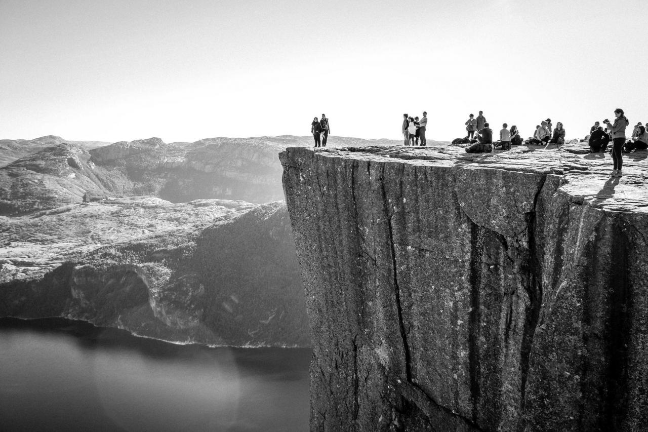 在垂直落差604米的山谷中屹出的天然平台,俯瞰峡谷中的吕瑟峡湾,起伏的山峦、蜿蜒的峡湾,以及峡湾中漂浮着的游船... 宛如展开一幅风景长卷。布道石因为陡峭直立于峡湾之上,地势高且开阔,常常会刮起不小的风,这个时候,要站到边缘看风景很需要勇气。有些人甚至不敢站起来,他们坐着甚至趴着往前蹭,无论怎样的方式,敢于靠近岩石边缘,即便是用趴着的方式表示对自然的敬畏,也是值得敬佩的。