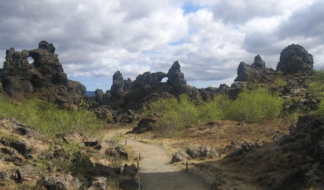 雷克雅里德是米湖旅游的首选之地,主要旅行团、旅客服务中心、住宿区、加油站都在这里,附近还有著名的地热发电厂。地热区也是米湖的特色,时常可以看到各种地热景观,如滚烫的泥浆、蒸汽口、喷泉、温泉湖等。难怪乎,当年美国宇航员登月前的训练选择这个地方。还可以爬到山上远眺。在湖东山坡下,有一簇黝黑的嶙峋怪石,这些怪石有的状如尖塔、有的又状似城堡,簇拥在一个狭长的谷地周围,远远望去,火山口犹如一座雄伟的黑色古堡,这是米湖的一大奇景。