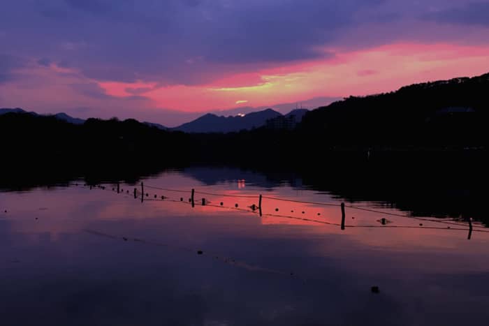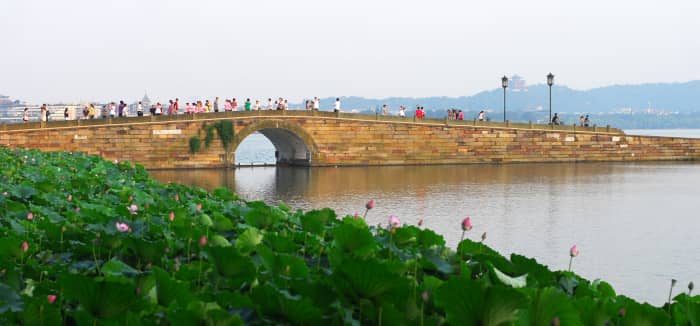 浴鹄湾的旁边就是花港观鱼,因为大部分游客都会往花港观鱼去,所以浴鹄湾虽然离主干道很近,却很清幽。浴鹄湾最亮眼的景观是长长地跨在水面上的霁虹桥,姿态优雅,到傍晚时分映衬着夕阳和晚霞的时候尤其美。