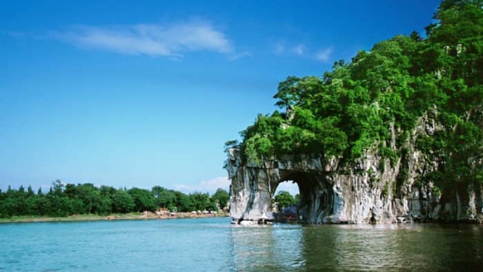 象鼻山原名漓山,是桂林的城徽山,位于广西桂林市内桃花江与漓江汇流处,其山酷似一头驻足漓江边临饮水的大象,栩栩如生,山体前部的水月洞,弯如满月,穿透山体,清碧江水从洞中穿鼻而过,洞影倒影于水面,好一幅”象山水月“之奇观也!2017年因桂林分会场花落象山景区,荣升5A旅游景区。