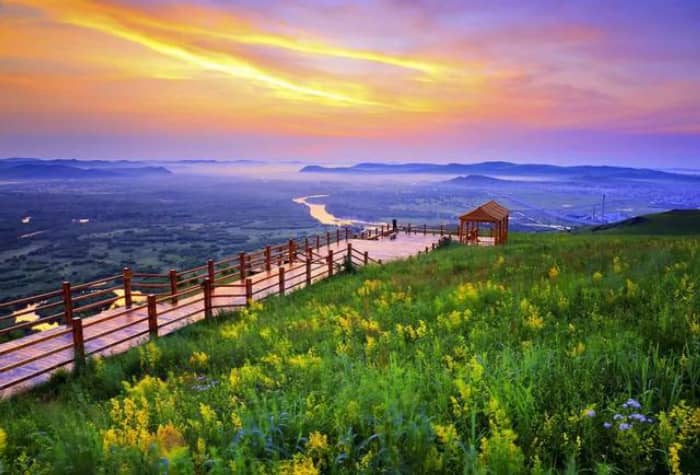 乌兰布统草原因清朝康熙皇帝曾在这里大败噶尔丹而闻名于世,清朝初年的乌兰布统一战,稳定了祖国北部边疆,奠定了清朝大一统江山的基础。这里风光旖旎,有辽阔的草原、延绵起伏的山脉、一波三折的河流、茂密的森林,还有将军泡子等古战场遗迹,风景如画。影视基地每拍一部影视剧就将一块石碑放倒在草原上,很多游客都围在石碑旁数着影视剧的名称并拍照留念。这里是拍摄日出和平流雾的最佳景点之一。