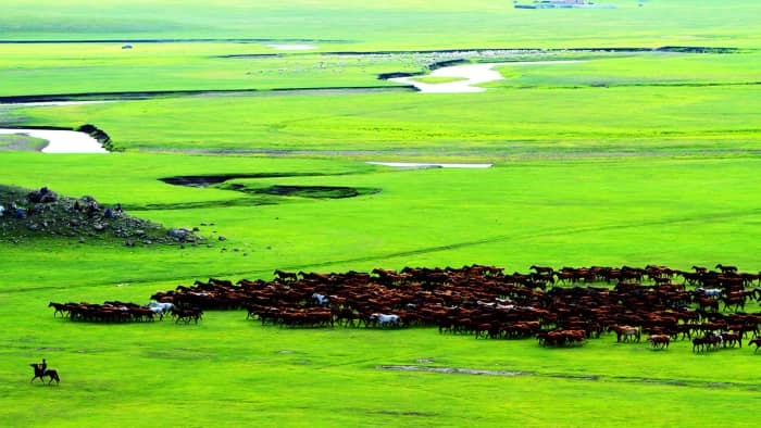 内蒙古自治区土地总面积占全国12.3%,横跨东北、华北、西北地区,接邻中国八个省区,北与内蒙古、俄罗斯联邦接壤。由于地域辽阔,地貌复杂多样,内蒙古的旅游资源非常丰富,著名的有呼伦贝尔、鄂尔多斯、鄂伦春、腾格里沙漠、大兴安岭等,草原、湖泊、沙漠、森林,加上特色的蒙古包和流动的牛羊群,在蓝蓝的天空下策马扬鞭,“风吹草低见牛羊”的场景就在眼前上演。
