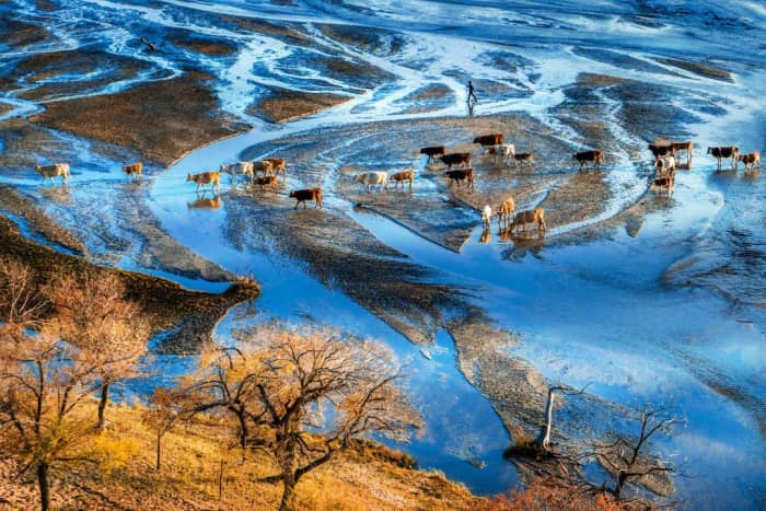 额济纳胡杨林旅游区,位于内蒙古最西部的阿拉善盟额济纳旗境内的额济纳河两岸,这里的是全球仅存的胡杨林区之一。如今这里是摄影爱好者的天堂,电影《英雄》的拍摄地之一。每年国庆节前后的两三周内,这里会举办胡杨节,节日期间,几十万游客从四面八方来到这个只有几万常住人口的小镇,观赏着绚烂耀眼的金黄色胡杨林和一望无际的茫茫荒漠。