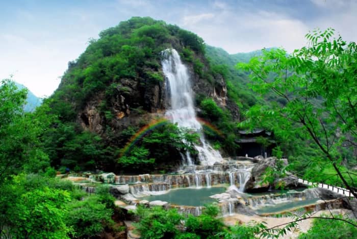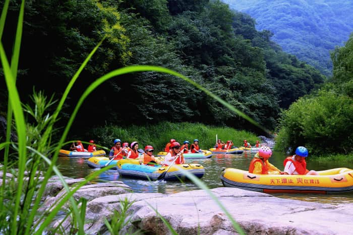 晚上也可以住在这里,有小别墅能住四个人,院子里也有个温泉,可以体验一下夜跑的感觉,走两步去隔壁吃个农家菜,大蒸馍真好吃,小米汤真好喝,人均40左右。第二天睡到自然醒你就可以返程了,总结来说,如果你想周末放松解压一下,这个景区又刺激又安逸,夏天你可以永远相信漂流。