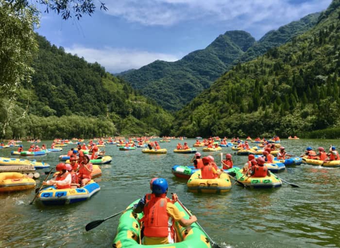 如果你有两天一夜的时间打算出去放松一下,那么这个人均350元又能漂流刺激又能温泉放松的地方,我诚挚地安利给你,跟着我的攻略即刻出发吧,建议自驾去会方便一些,导航到豫西大峡谷下,我们是从洛阳出发十点半到的景区,168元门票,漂流从上午十一点半到四点之间都有,建议到了先玩漂流,你可以在门口买上泼水装备,盆、瓢、水枪都可以还价,你要记得做好防晒,建议长袖长裤洞洞鞋防水袋加换洗衣服,门口有可以托运衣物到漂流终点的服务,每个柜子十块。